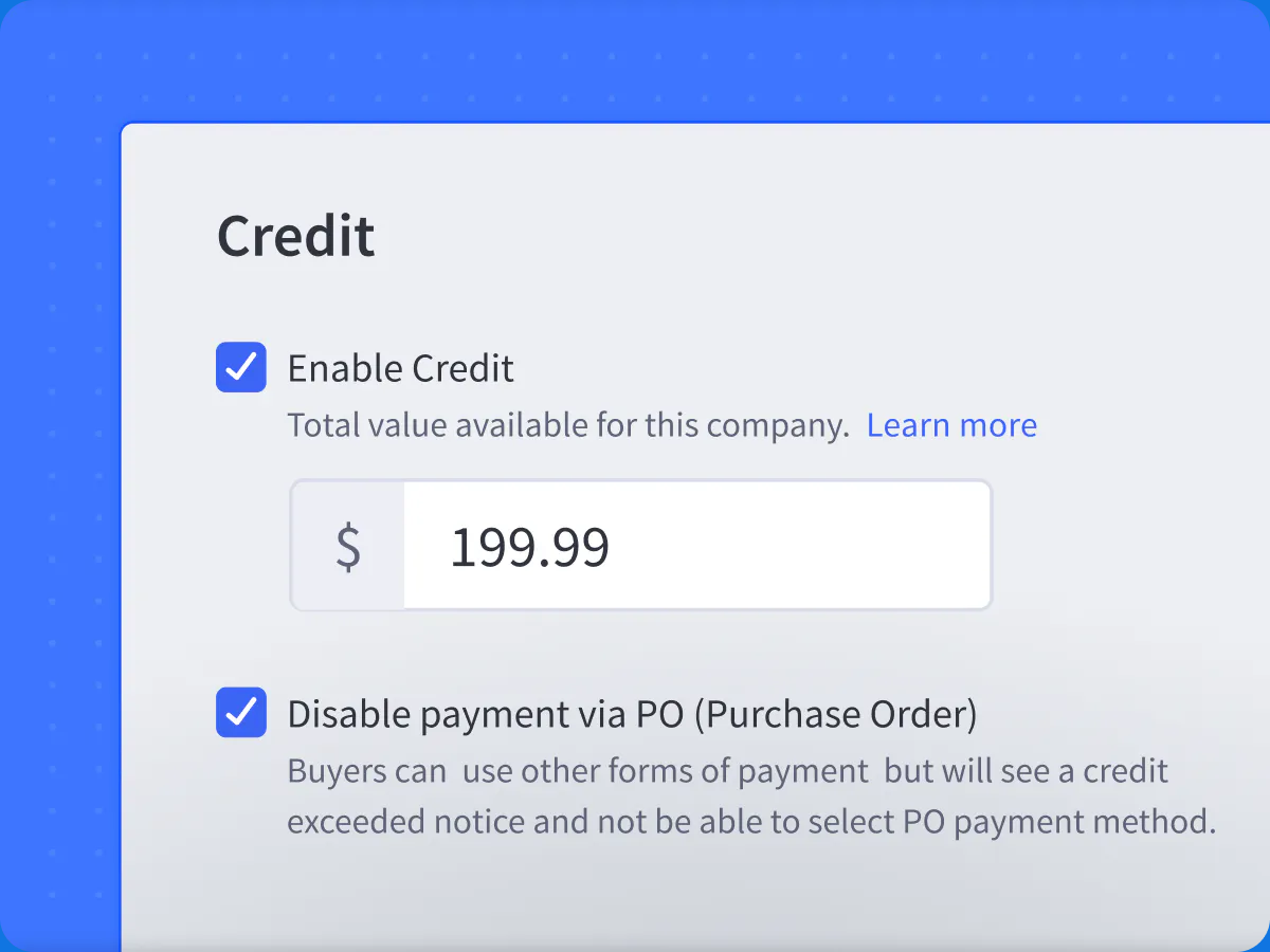 Credit availability functionality enables you to better sync a buying company’s credit availability and their online account from your system of record. Automatically limit purchases when credit thresholds are exceeded.